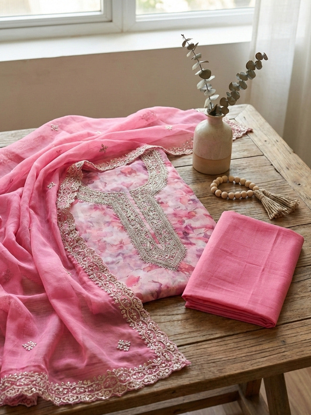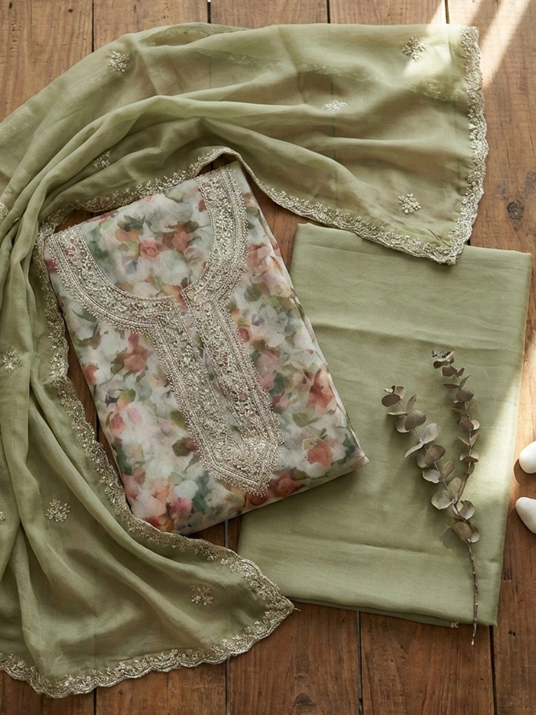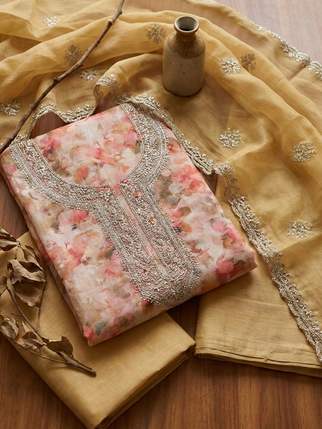 Printed Cotton Blend Unstitched Suit With Pant & Dupatta