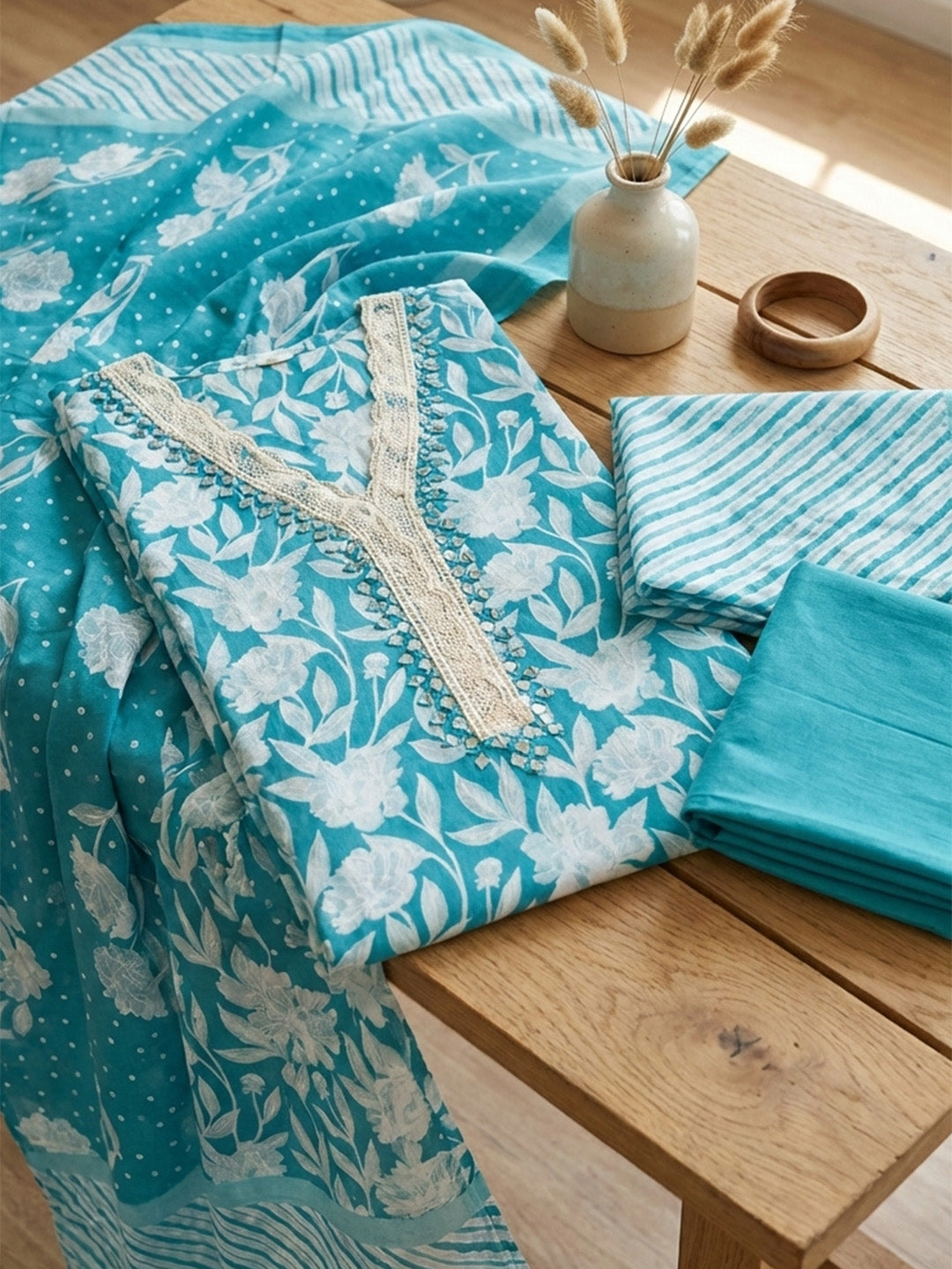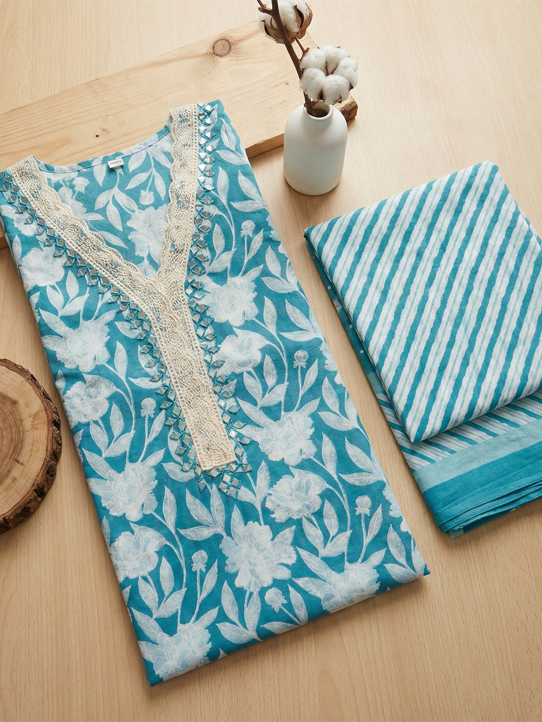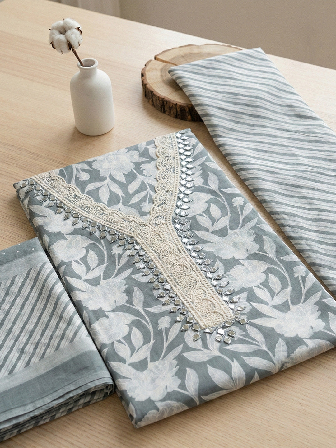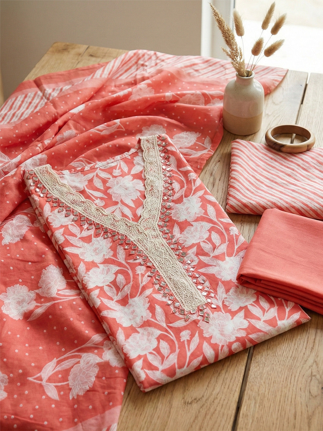 Printed Chanderi Unstitched Suit With Pant & Dupatta