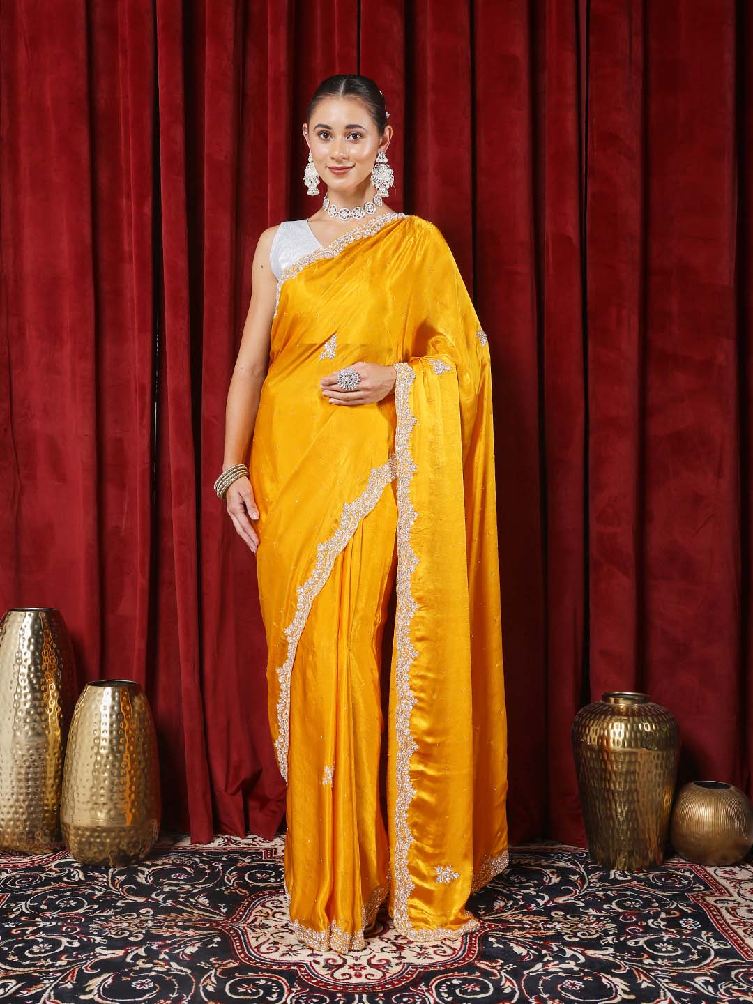 Note:The blouse shown in the pictures is just for Photoshoot purposes. The blouse you will get will be an attached running blouse.