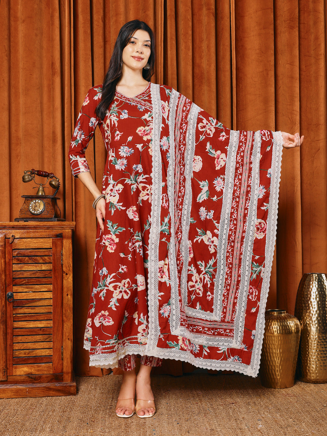 Printed Cotton Blend Kurta With Pants & Dupatta