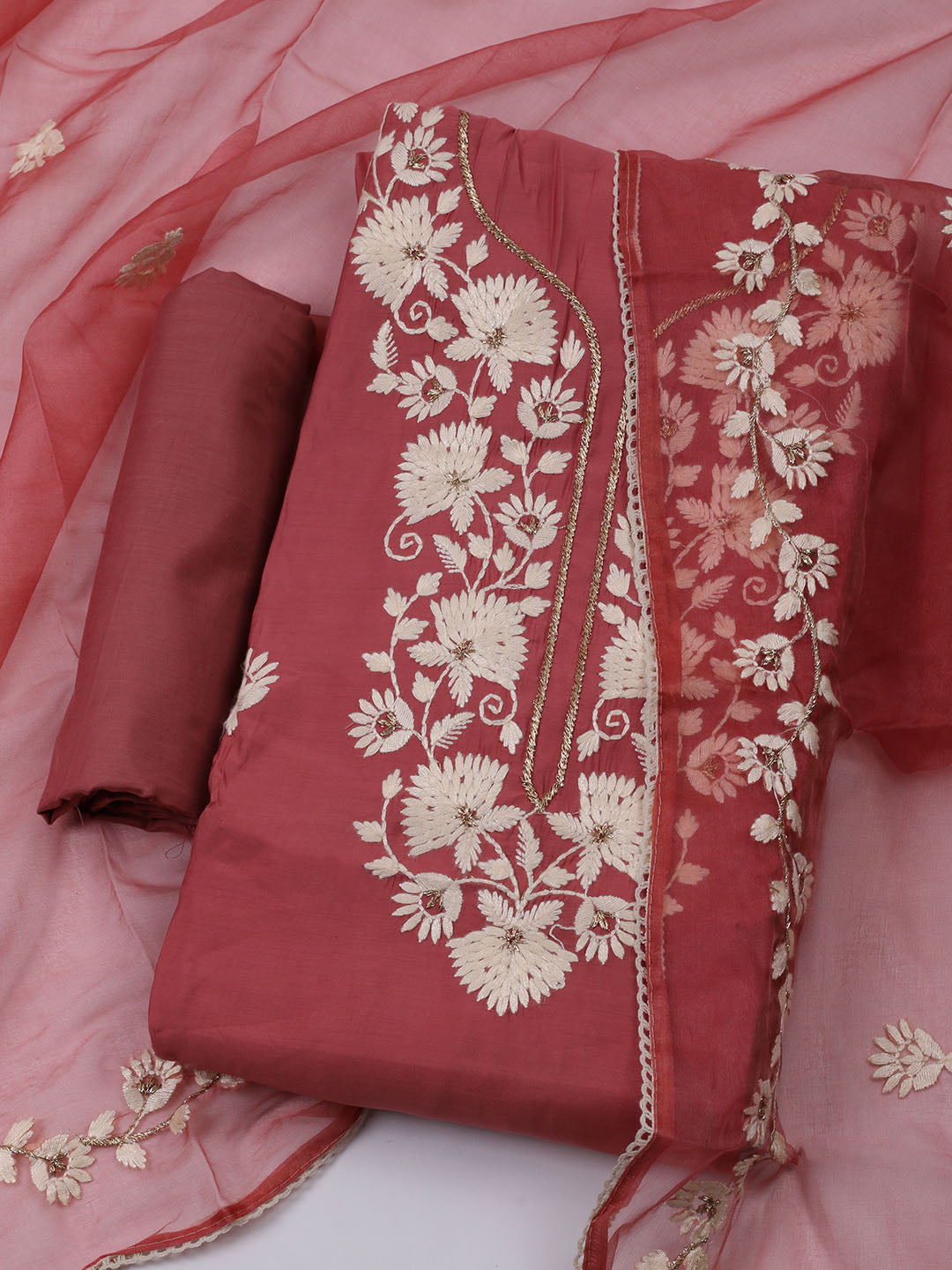 Neck Embroidered Chanderi Unstitched Suit With Dupatta