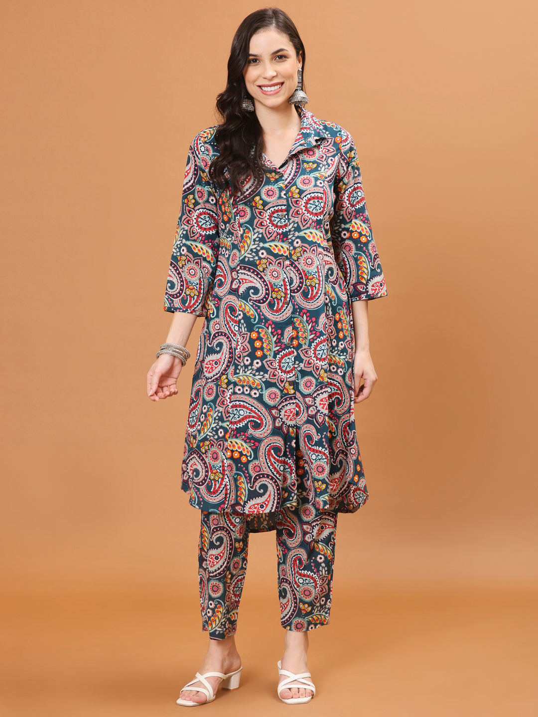 This stylish cotton blend kurta set is designed for everyday wear, featuring a beautiful floral print that adds a touch of elegance. The A-line kurta offers a relaxed fit with a shirt collar and 3/4th sleeves, providing both comfort and sophistication. The regular-length kurta paired with matching pants, creates a flattering silhouette. This ensemble combines practicality with chic design, making it a perfect addition to your wardrobe. It is ideal for casual outings, relaxed days with friends, or work at the office.