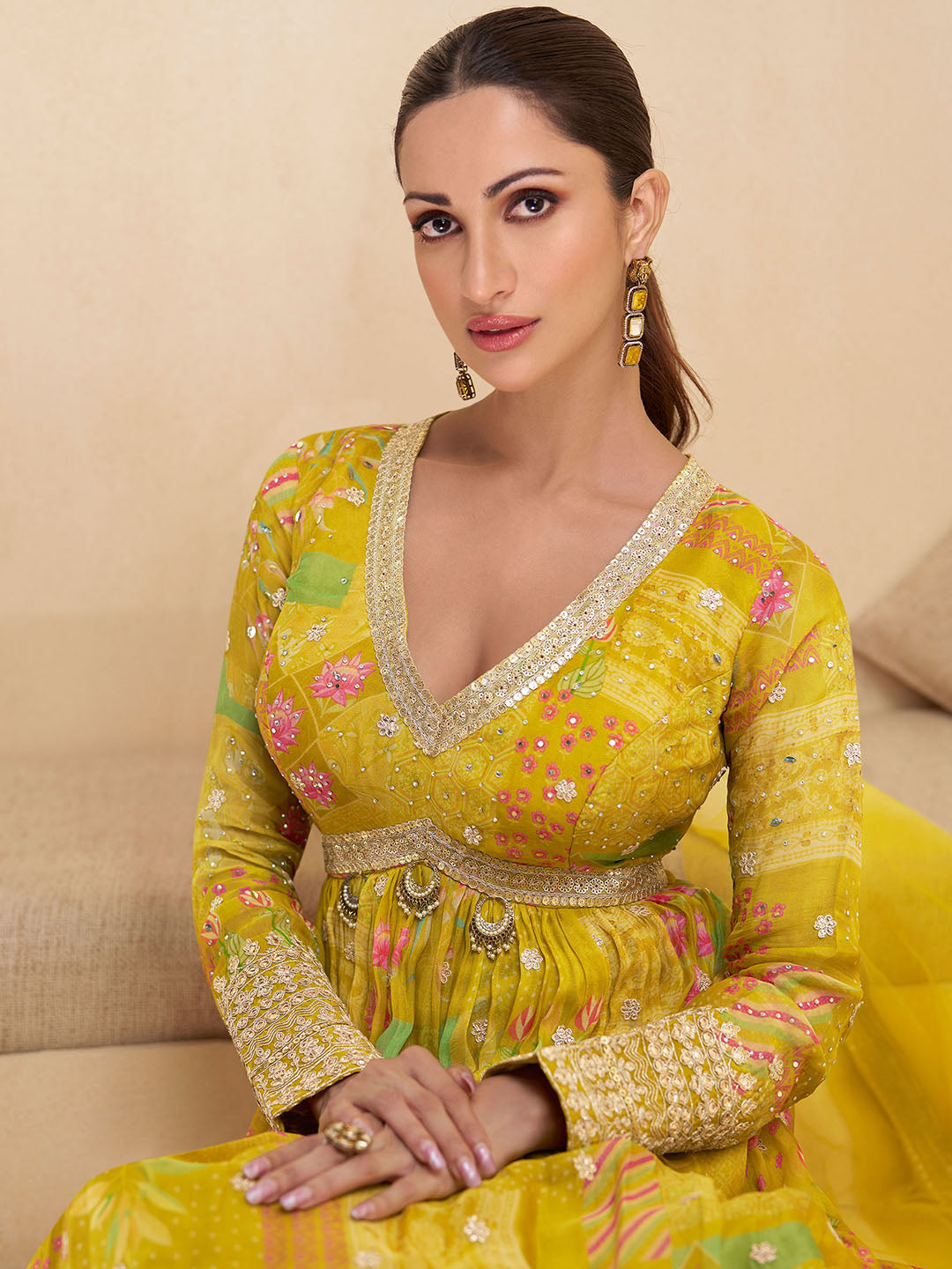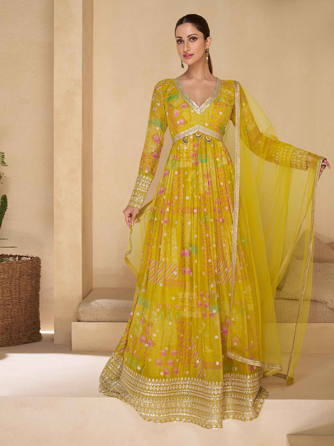 You have an excellent choice! Our Anarkali gown dress with dupatta is an ultimate festive choice for multiple occasions throughout the year. Go for georgette fabric for beautiful designs and vibrant colors. This Anarkali gown dress has an attractive plunging V neckline with a waist embroidered belt. With long sleeves, floor-length & multicolored floral print - our signature style ethnic piece is a work of art. Invest in gold jewellery to pair this gorgeous gown dress, and complete the look with a quick floral hairdo & platform heels.