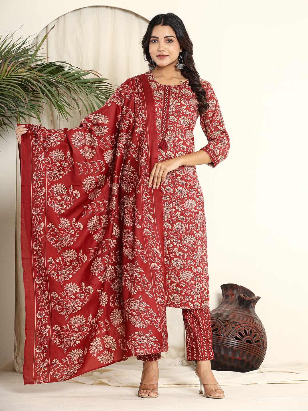 Printed Cotton Blend Kurta With Pants & Dupatta