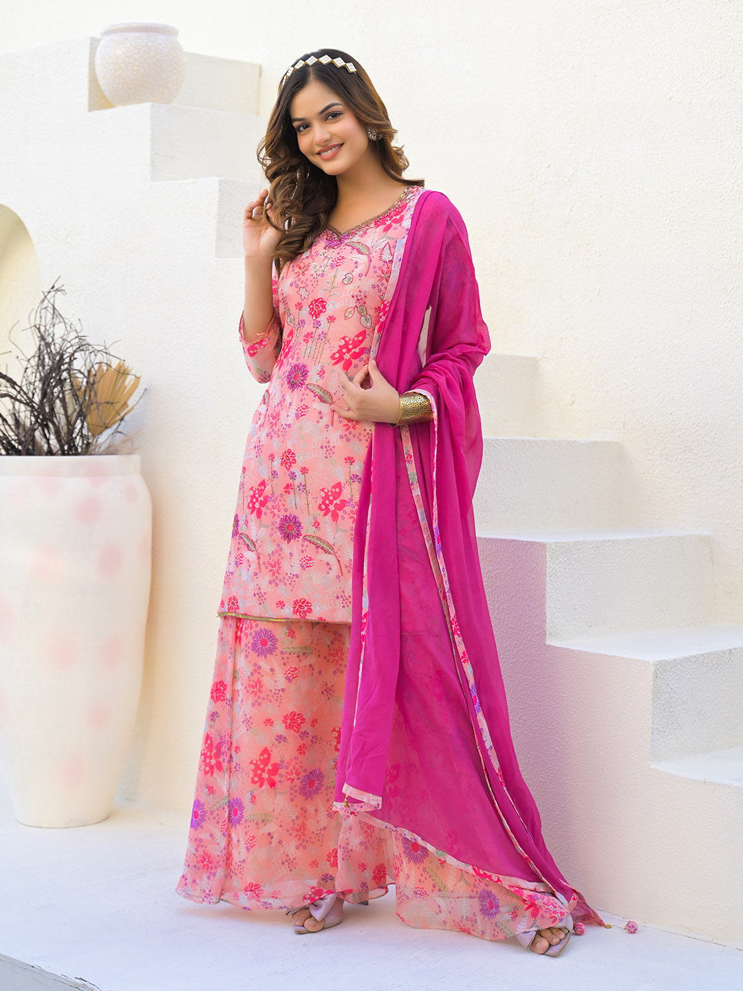 Neck Embroidery Georgette Kurta With Sharara And Dupatta