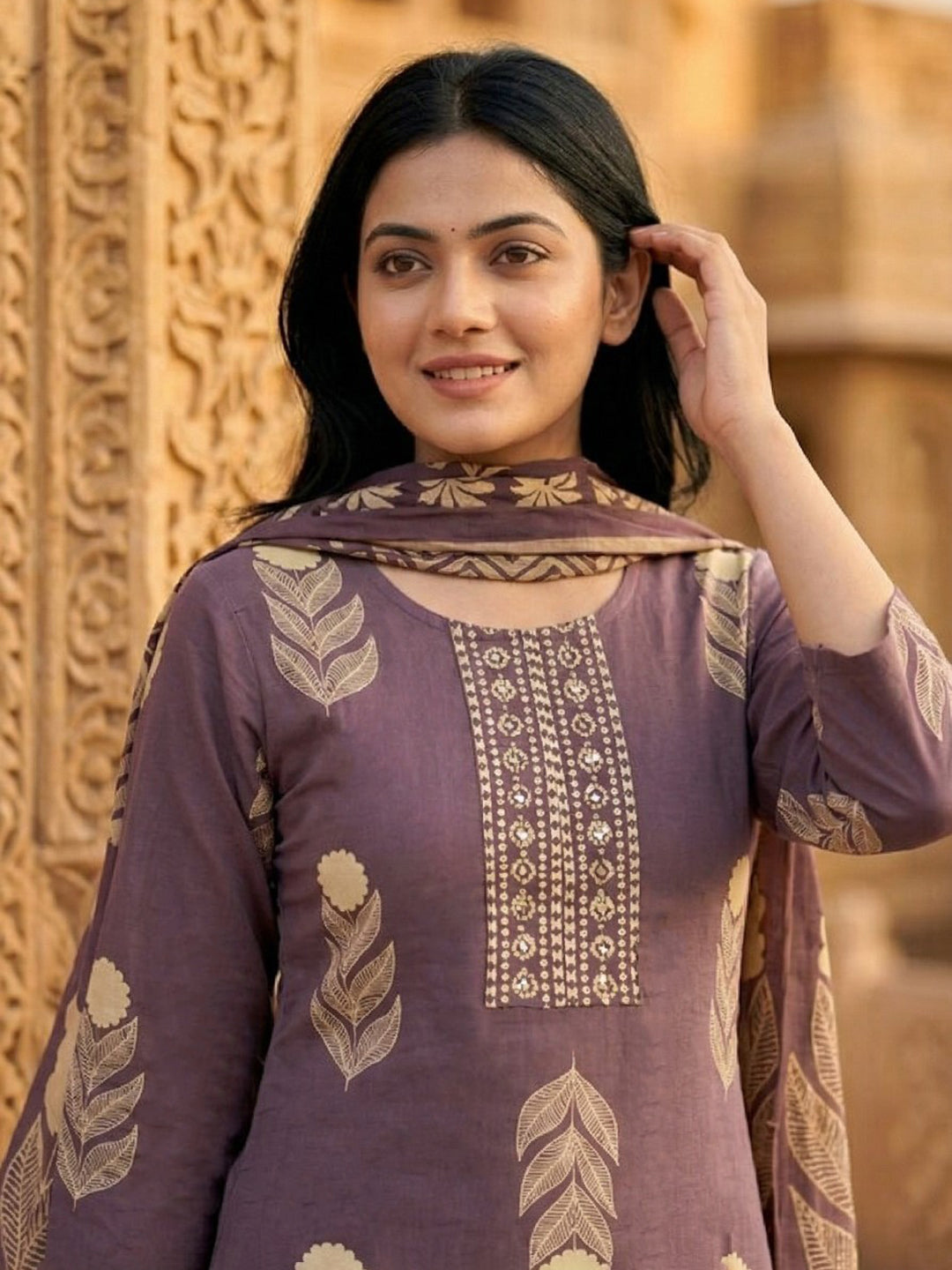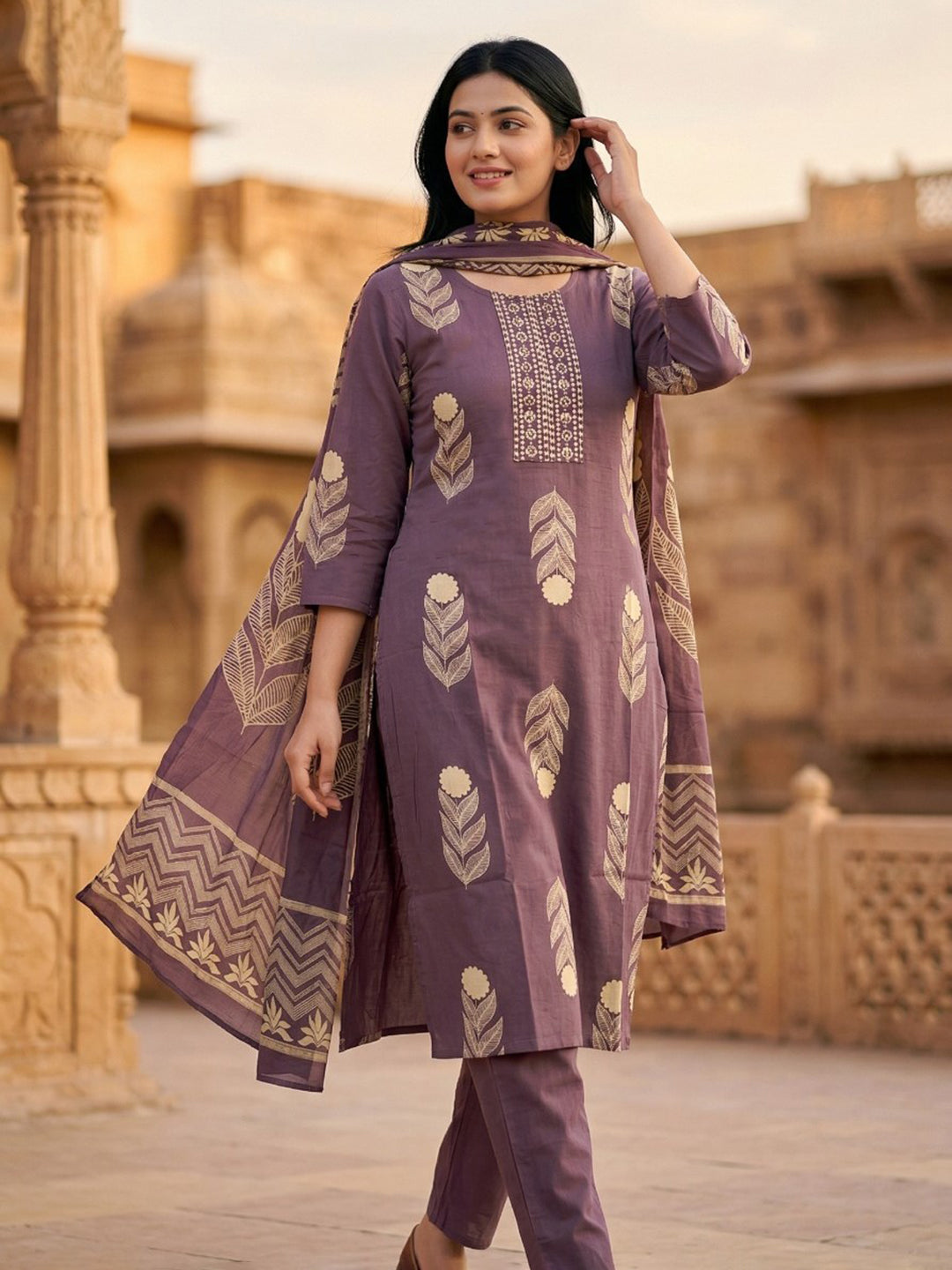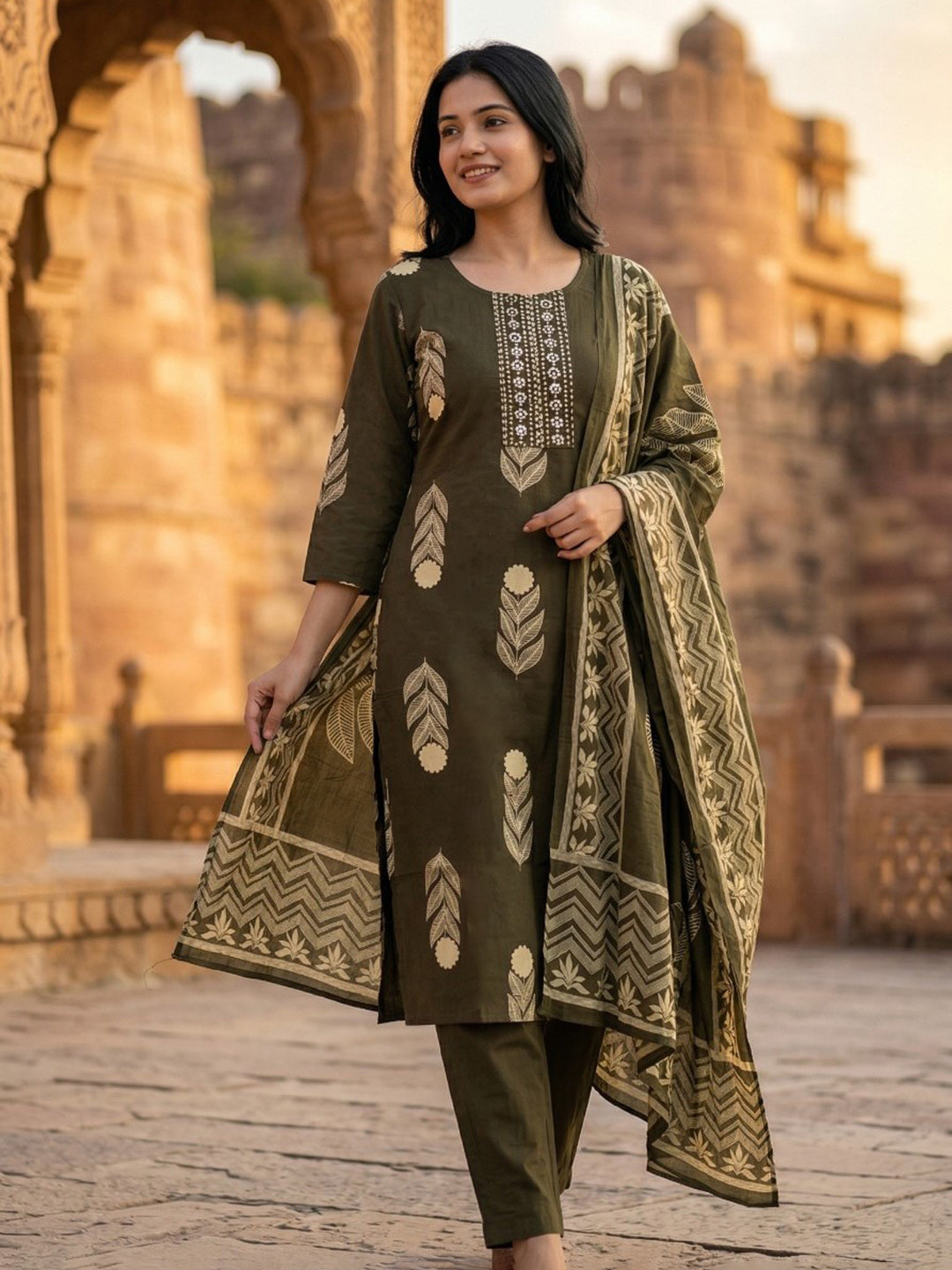 Embroidered Cotton Blend Kurta With Pant & Dupatta