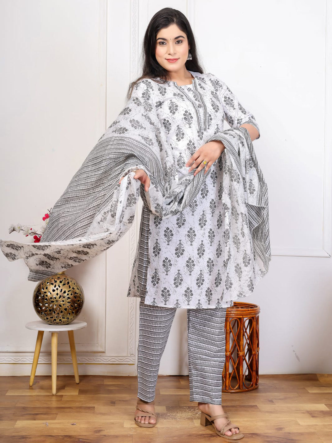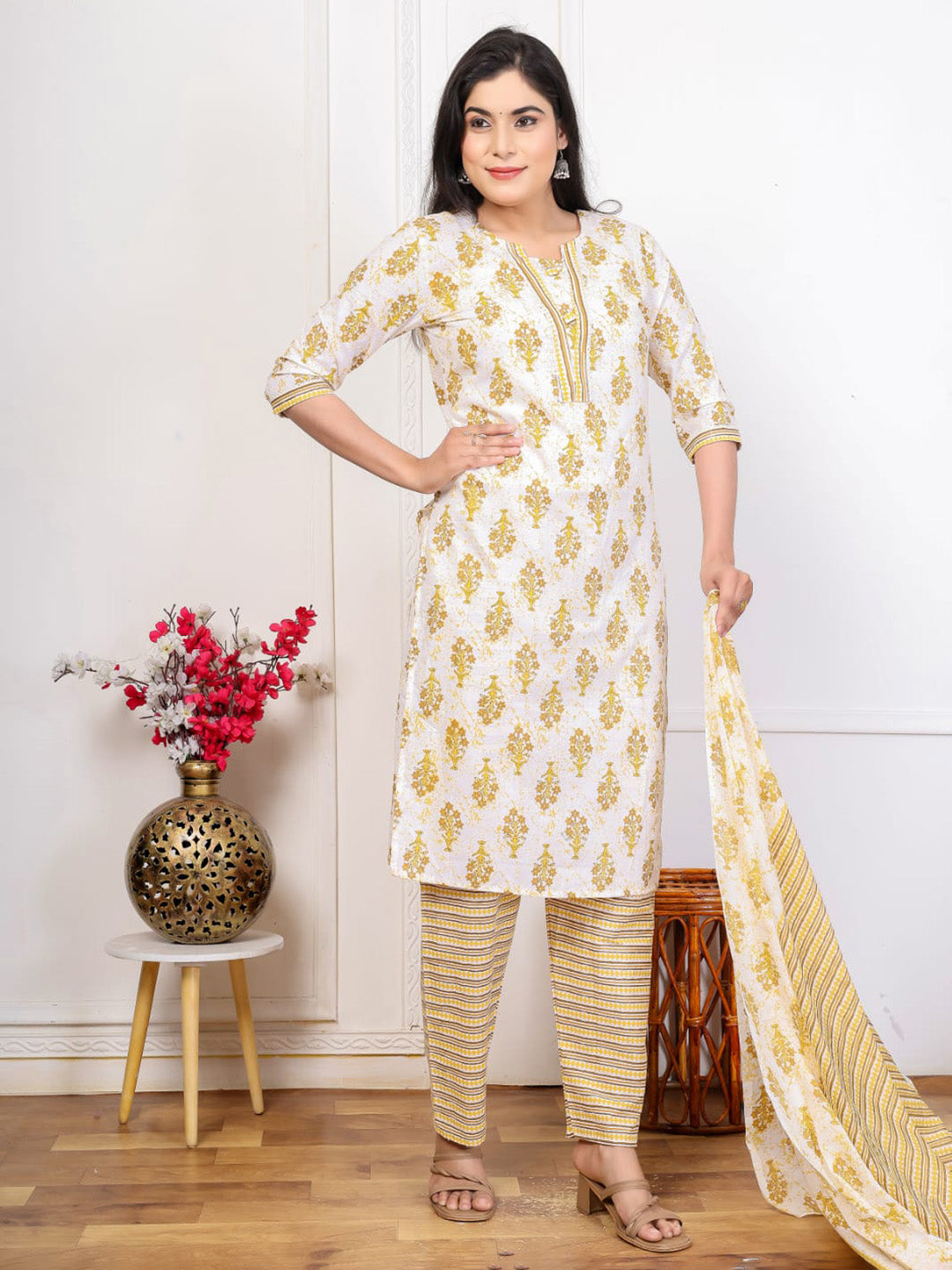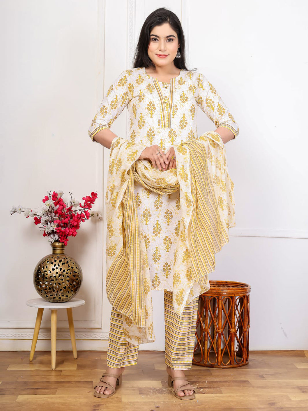 Embroidered Cotton Blend Kurta With Pant & Dupatta